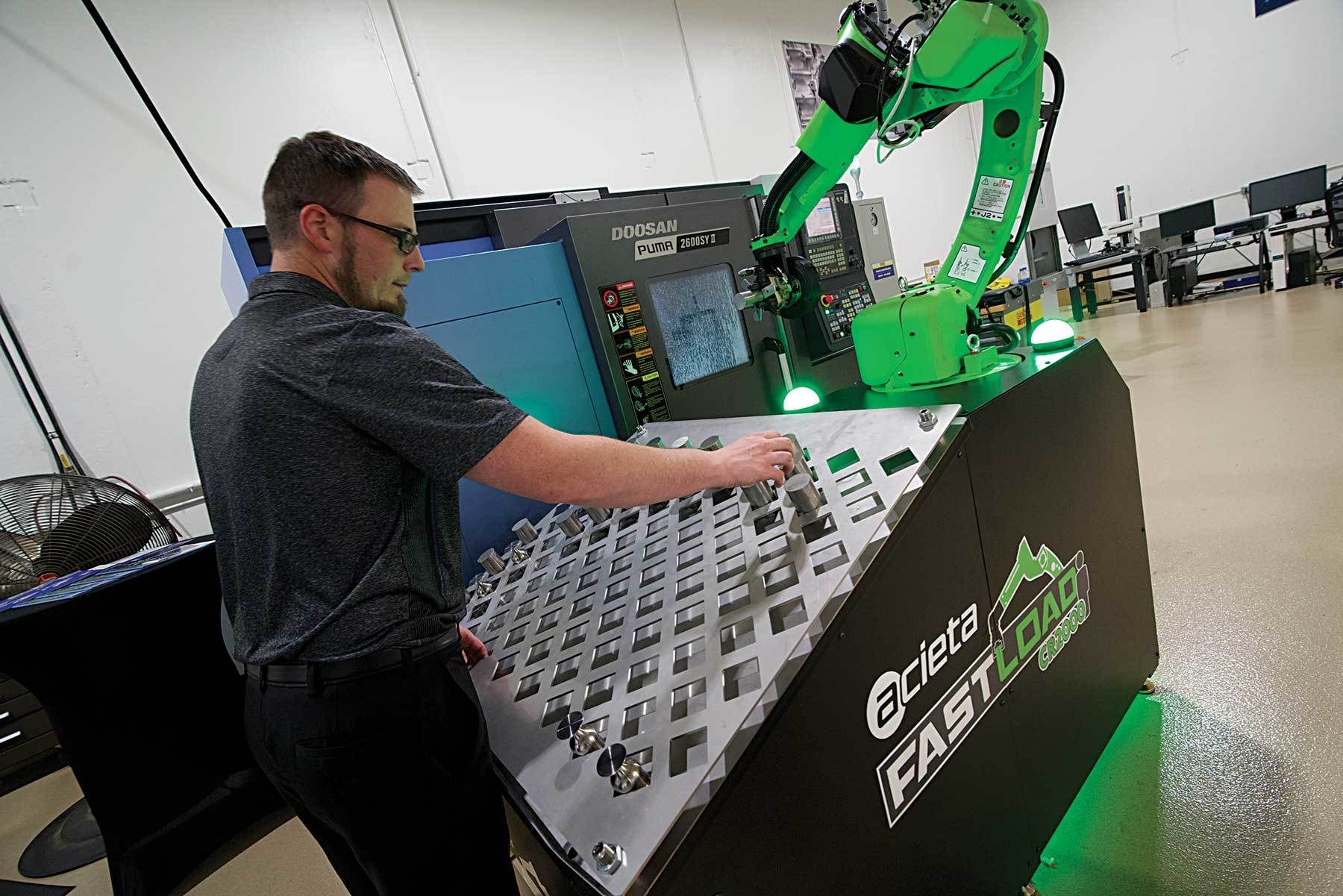 This preconfigured robotic cell is designed to help manufacturers address labor shortages. Photo courtesy Acieta LLC