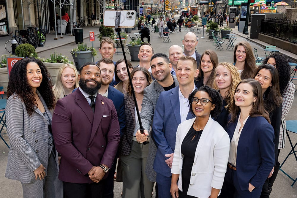 ENR’s 2025 Top 20 Under 40 honorees take a selfie while taking in the sights of Midtown Manhattan. Photo by Bruce Buckley for ENR